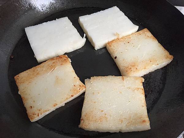 油紋出現後(繼續維持中小火即可),將切片好的菜頭粿依序放入油鍋,下鍋後千萬不要急著推、擠、翻、弄,此時需要的是耐心等待,觀察菜頭粿側邊底部有出現淺黃色的樣子後,這時用鍋鏟可以順順的推動菜頭粿即可準備翻面。